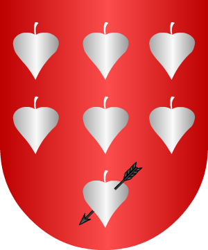 de sable. 31.- En el expediente del Caballero de la Orden de Alcántara de Pedro Nicomedes Campos de Orellana y Calvo, natural de La Haba (Badajoz), año 1861, constan las siguientes armas: Escudo partido: 1º, en campo de sinople, tres barras curvas de gules, y 2º, en campo de azur, diez roeles de oro. 32.- En la calle de los Aranda, de la ciudad de Granada, constaban las siguientes armas: Un árbol terrasado y dos leones rampantes contramirándose. Bordura con dieciocho losanges. 33.- Los de Granada, según Francisco Fernández de Béthencourt, traen: En campo de oro, un árbol terrasado de sinople, atravesado de dos zorras de su color natural, andantes, la primera contornada, al pie del tronco. 34.- Otros, en Portugal, tienen: En campo de azur, tres cabezas de león de oro degolladas, lampasadas de gules y puestas en triángulo mayor. 35.- Los radicados en Punta Arenas (Chile), según Vicente de Cadenas, usan: En campo de oro, un árbol, de sinople, con dos leones, de gules, empinados a su tronco. Bordura de plata con siete cabezas de moro. Divisa: "Campi tui replebuntur ubertate". 36.- Finalmente, diremos que en Flandes tuvo asiento una familia de este apellido, cuyas armas se organizan así: En campo de plata, tres fajas de gules brochantes sobre ellas, tres barras del mismo color. Complemento de información de estos linajes por cortesía de blasonari.net |