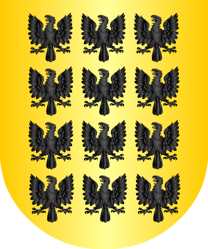 de oro, bordura de ocho compones de oro. 7.- Los radicados en Madrid, según Vicente de Cadenas, traen: En campo de gules, una cinta, de oro, puesta ondulada y en banda. 8.- Los radicados en Elna, según Vicente de Cadenas, usan: En campo de sinople, dos castillos, de gules, perfilados de oro. Información de estos linajes complementada por cortesía de blasonari.net |
