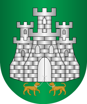 gules, un castillo de plata y dos perros de este metal atados a la puerta, con