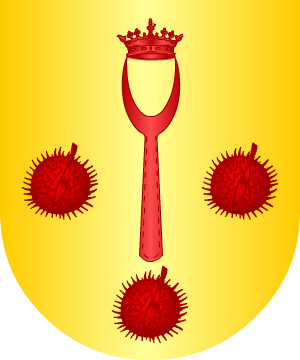 con media flor de lis de plata y un ala de oro. 6.- Otros: En campo de oro, un pino sumado de la imagen de la Virgen de la Inmaculada Concepción; al pie del pino un buey pasante. Bordura de oro cargada de ocho escudetes de gules partidos, con media flor de lis de plata y medio vuelo de oro, unidos en la línea de intersección. 7.- Otros, según Jorge de Montemayor, traen: En campo de oro, un árbol de sable. Bordura de plata con ocho escudetes de gules. 8.- Otros: En campo de plata, ondas de azur y plata y sobre ellas, un pez, de su color. 9.- Otros: En campo de oro, una encina, de sinople, arrancada y acompañada de una espada, en la diestra. 10.- Los de Ávila, según Rietstap, traen: De plata, un palo, de gules, cargado de dos besantes, de oro. 11.- Los de Aragón, según Rietstap, usan: De oro, un árbol arrancado, de sinople. 12.- Otros de Aragón, según Rietstap, traen: De azur, un árbol de sinople, terrasado de lo mismo y frutado de oro. Bordura de gules, cargada con ocho escudetes de azur, cargado cada uno de tres flores de lis, de oro, bien ordenadas. 13.- Los de Castilla, según Rietstap, usan: Escudo cuartelado: 1º y 4º, de plata con un árbol de sinople, terrasado de lo mismo y frutado de oro, acompañado de un lobo pasante, de sable, atravesado al tronco; 2º y 3º, de azur, cinco veneras, de oro, colocadas en aspa. 14.- Otros, según Rietstap, traen: Escudo partido: 1º, de azur, un tallo de castaño, de oro, frutado de cinco castañas, de lo mismo, colocadas una, dos y una, terrasado de sinople, y un perro pasante, de oro, atravesado; 2º, de azur, cinco veneras de oro, colocadas en aspa. 15.- Los de Milán, según Rietstap, traen: Escudo cortado: 1º, de oro, un águila de sable, coronada de oro; y 2º, de azur, una faja, de oro, cargada de una C de azur. 16.- Otros de Milán, según Rietstap, usan: Escudo cortado: 1º, de oro, un águila de sable; 2º, de gules, tres bandas, de plata; brochante sobre el centro del escudo, una faja, de azur, cargada de dos C góticas, de plata. 17.- Los de Lombardia, según Rietstap, traen: De oro, un tenedor, con mango corto y adornado, de gules, de dos dientes (puntas), sumado de una corona del mismo color, y acompañado de tres castañas de gules, colocadas, dos en los flancos y una en punta. 18.- Los de Sicilia, según Rietstap, usan: De azur, una rama de castaño, frutada de cinco castañas colocadas una, dos y una, todo de oro, sobre una terrasa de sinople. 19.- Los de Roma, según Rietstap, traen: En campo de oro, una banda de gules, cargada de tres bezantes, de oro. 20.- Otros de Roma, según Rietstap, traen: De azur, un árbol de sinople, terrasado de lo mismo y frutado de oro, con un unicornio pasante, de oro, atravesado al tronco, en jefe una estrella, de oro. 21.- Los de Nápoles, según Rietstap, usan: De azur, un árbol de sinople, frutado de oro, acompañado de dos leones rampantes y afrontados, del mismo color, todo sobre una terrasa de sinople. 22.- Otros de Nápoles, según Rietstap, traen: De azur, una faja de oro, acompañada en jefe de tres veneras, de oro, colocadas en faja, en punta tres bandas de oro. 23.- Los de Venecia, según Rietstap, usan: De oro, un árbol de sinople, frutado de oro. 24.- Los de Bolonia, según Rietstap, usan: De azur, una faja de gules, acompañada en jefe de las letras O C del mismo color. Jefe de oro, cargado de un águila de sable, coronada de oro. 25.- Otros de Bolonia, según Rietstap, traen: De azur, una campana de plata, acostada de dos leones rampante y afrontados de oro. Jefe de azur, cargado de tres flores de lis, de oro, colocadas entre los huecos de un lambel de cuatro puntas, de gules. 26.- Los de Francia, según Rietstap, usan: De gules, una castaña, de oro. 27.- Los de Flandes, según Rietstap, traen: De oro, tres bandas, de gules, acompañadas de dos roeles, de sinople, una en el jefe a la siniestra y el otro en punta a la diestra. 28.- Los de Colonia, según Rietstap, usan: De sinople, diez bezantes, de oro. 29.- Los de Bohemia, según Rietstap, traen: De azur, cinco bezantes, de oro, colocados en aspa. 30.- Los de Hungria, según Rietstap, usan: De azur, una barra, de gules, brochante una banda, de plata; el sotuer formado cantonado de cuatro bezantes de oro. Información de estos linajes por cortesía de blasonari.net |