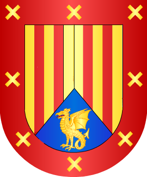 de plata, con el dragón de sinople. Bordura de gules con ocho aspas de