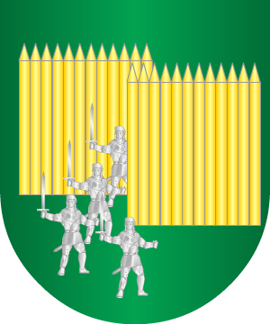 con una cuerda de este color. 2.- a casa de la Montaña de Santander ostentó: En campo de gules, una banda de oro engolada en cabezas de dragones de sinople y acompañada en lo alto de un lobo de sable lampasado y armado de gules. 3.- La casa de la Montaña de Santander ostentó: En campo de gules, una banda de oro engolada en cabezas de dragones de sinople y acompañada en lo alto de un lobo de sable lampasado y armado de gules, y en lo bajo un lobo, de sable. 4.- Los radicados en Extremadura y Aragón, establecidos en la ciudad de Los Reyes (Perú) en el siglo XVII y posteriormente a Quito (Ecuador), según Vicente de Cadenas, usan: En campo de oro, una banda de gules, engolada en dragantes de sinople, acompañada de dos lobos pasantes, de sable. 5.- Otros: En campo de sinople, una empalizada de oro y saliendo de ella, varios guerreros, de plata, con espadas en la mano. Complemento de información de estos linajes por cortesía de blasonari.net |
