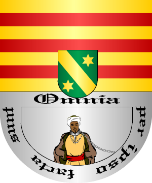 Fernández de Córdoba.- Cortado: 1.º, en oro, tres fajas, de gules; 2.º, en plata, el busto de un rey moro al natural, cautivo, con una cadena al cuello, de sable; bordura de este cuartel, de plata, con la leyenda en letras de sable: “Omnia per ipso facta sunt”. Escusón: En sinople, una banda, de oro, acompañada de dos estrellas de seis puntas, del mismo metal, una a cada lado (correspondientes al marquesado de Arcicóllar). (Ref.: CADENAS) |