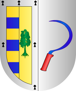 García de Dornilla: León: Partido: 1º, partido a su vez: primero en oro, tres fajas de gules; segundo, en oro, un árbol arrancado de sinople; bordura general de plata con seis armiños, de sable, tres en jefe, dos a los flancos y uno en punta, y 2º, en plata, una hoz, de azur, encabada de gules. (ref.: CADENAS). |