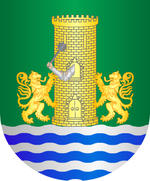 torre de oro sobre ondas de agua de azur y plata. Bordura de gules con ocho