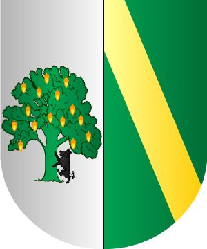 1º, en campo de oro, un árbol de sinople, con una loba y dos lobeznos