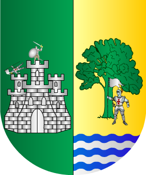 Escudo partido: 1º, en campo de sinople, un castillo de plata, y en la