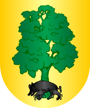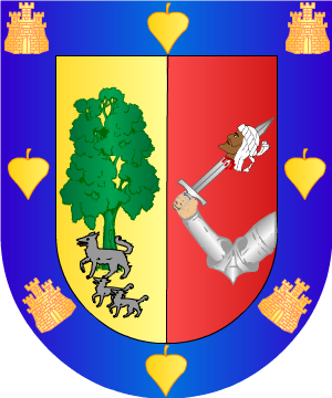 1º, en campo de oro, un árbol de sinople, con una loba y dos lobeznos
