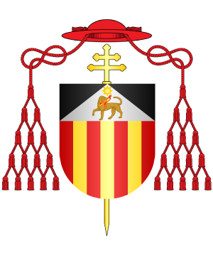 3.- Fray Jerónimo Xavierre usaba por armas: En campo de gules, tres palos de oro, cargados de tres roques de gules (Xavierre); el jefe de plata, cortinado de sable, con un perro pasante, al natural, con la cabeza vuelta, sosteniendo con la boca un halcón de oro y gules; surmontado de una estrella de oro, de ocho puntas (Orden de Predicadores) Llevaba acolada la cruz flordelisada, jironada de plata y sable, de su Orden y sostenían el escudo dos tenantes en forma de ángeles. Al timbre capelo y cordones cardenalicios, de gules. (Respecto a las figuras del jefe, correspondientes a la Orden Dominicana, se dice que el perro es símbolo de fidelidad, el halcón de la predicación, y la estrella de felicidad y sublimación). Este escudo se halla en el Convento Dominico de Torrent (Valencia).