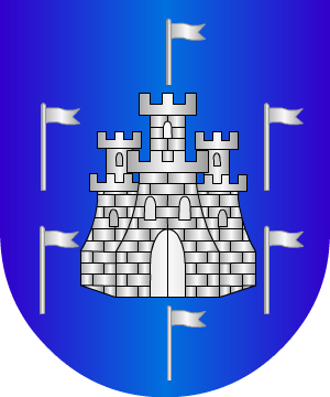 De azur, un castillo de plata, rodeado de seis banderas de lo mismo. (Ref.: CADENAS), (ref.: QUEREJETA). |