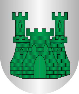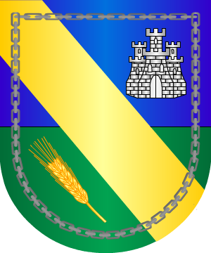 Cortado: 1.º, en azur, un castillo, de plata, siniestrado, y en orla, media cadena; 2.º, en sinople, una espiga, de oro, adiestrada, y en orla, media cadena, resaltados ambos cuarteles de una banda de oro. (Ref.: NO CONSTA) |