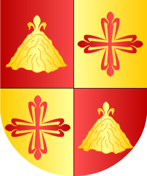 y 3º, en campo de gules, dos flores de lis de oro sobre unas rocas. 14.- Otros: Escudo cuartelado: 1º y 4º, en campo de gules, una cruz de oro, y 2º y 3º, en campo de gules, un monte flordelisado de oro. 15.- Otros: Escudo cuartelado: 1º y 4º, en gules, un monte de oro, superado de una flor de lis del mismo metal, y 2º y 3º, en oro, una cruz de gules, vacía y floreteada. 16.- Otros: Escudo cuartelado: 1ºy 4º, en campo de oro, una cruz floreteada, y 2º y 3º, en campo de gules, un monte de rosas de oro con una flor sobre él. 17.- Otros del Rosellón: De oro, una cruz de Tolosa
