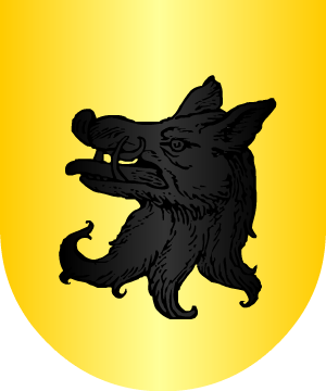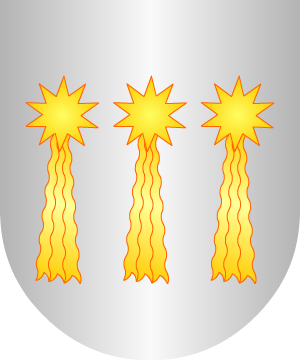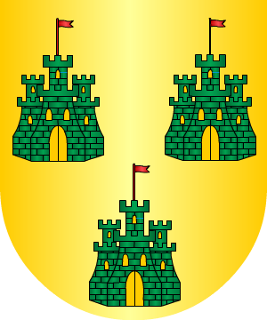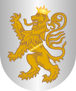 En campo de plata, un león de su color natural rampante y coronado de oro, con una cadena de este metal ceñida a su cuerpo.