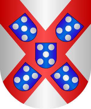 1. En campo de plata, cinco escudetes de azur, puestos en cruz y cargado cada uno de cinco bezantes de plata. Que son las llamadas quinas de las armas reales de Portugal.