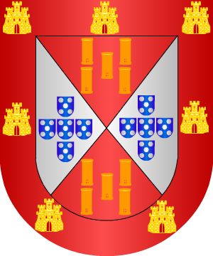 4. Los Torres y Portugal, Condes de Villardompardo y sus líneas: Cuartelado en sotuer: 1º y 4º. De gules con cinco torres de oro puestas en sotuer, y 2º y3º, las armas reales de Portugal descritas primeramente. Bordura general de gules, con siete castillos de oro.