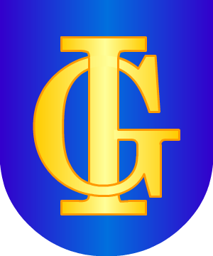 4.- Escudo tronchado alto: 1º, de oro, un monte de tres cimas de sinople naciente de la punta y sumado de una cruz de gules; 2º, de oro, cuatro palos de gules.