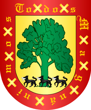 lobos de sable, lampasados de gules, pasantes al pie del tronco. Bordura de