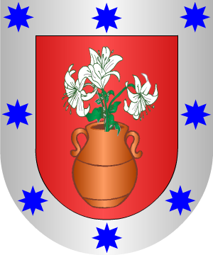 campo de plata, una banda de gules, cargada de tres flores de lis de oro, y