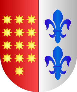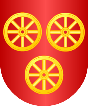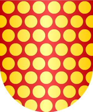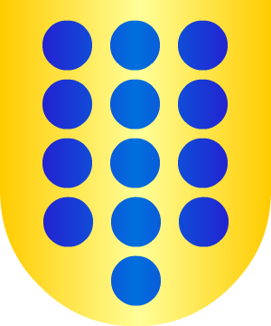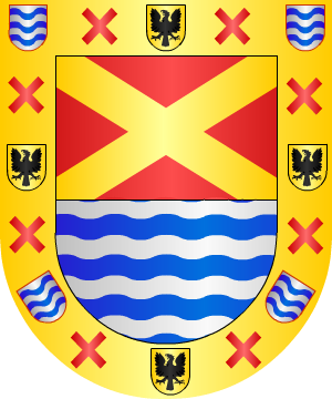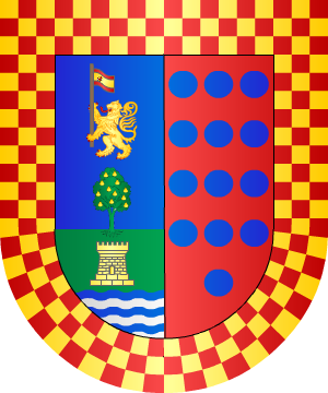 escudada, y 2º, en campo de oro, trece roeles, de azur. Bordura ajedrezada
