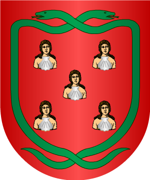 | Abraldes Abráldez Linaje gallego, de Santiago de Compostela (La Coruña). Armas De plata, una cruz de Calatrava vacía de gules. Bordura de plata con ocho escudetes de azur, cargado cada uno con cinco bezantes de plata puestos en sotuer, que son las quinas de Portugal. |