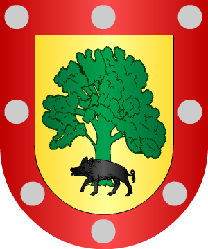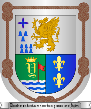 seis bezantes de plata, puestos de dos en dos. 20.- Los radicados en Madrid, según Vicente de Cadenas: En campo de oro, dos calderas, de sable, puestas en palo. Bordura de gules, con ocho panelas, de oro. 21.- Otros, según el Cronista Juan José Vilar y Psayla: Escudo ajedrezado de oro y gules. 22.- Otros, según Pedro Vitales: En campo de gules, un grifo de oro, surmontado de una estrella del mismo metal. 23.- Otros: En campo de gules, una cruz de veros de azur y plata. 24.- Otros: En campo de gules, una cruz de veros de azur y plata. Bordura de gules, con ocho aspas de oro. 25.- Los de Castilla y León, según Miguel de Salazar: En campo de sinople, un grifo de oro coronado, y surmontado de una estrella de oro. 26.- Los del valle de Trasmiera, según Miguel de Salazar: En gules, un grifo de oro. 27.- Los Agüero, de Agüero (Huesca), y sus ramas en Huesca y Zaragoza, traen: Escudo cuartelado; 1º y 4º, en oro, un águila de sable, y 2º y 3º, en gules, una flor de lis de oro. 28.- Otros: En campo de oro, un águila coronada de sable y uñada de gules. 29.- Los de Burgos, según Diego de Soto y Aguilar: En campo de gules, tres fajas de oro, verada de sable la central. 30.- Los de San Vicente de Toranzo (Cantabria), y radicados en Tegucigalpa (Honduras), traen: En campo de gules, un grifo, de oro, coronado, linguado y uñado, surmontado de una estrella, de oro, de ocho puntas en el cantón diestro y en el siniestro de una Y surmontada de una corona de oro. 31.- Mateo de Agüero y Marcos, Secretario del Consejo y Cámara de Indias, natural de Moraleja de Coca (Segovia), originario del lugar de Orejo (Cantabria), Caballero de la Orden de Carlos III desde 1732, usaba por armas: En campo de gules, un grifo de oro, con corona, portando una bandera desplegada de azur, perfilada de oro, y surmontada de una estrella del mismo metal. 32.- Otros, de Aragón, según J.-B. Rietstap, traen: En campo de oro, un león rampante al natural, que sostiene en la mano diestra una bandera de gules, cargada de una faja de plata, flotante a la siniestra, la cabeza del león surmontada de un sol de gules. 33.- En la casa de Agüero, en Agüero, constan las siguientes armas: Escudo cuartelado: en jefe abarcando ambos cuarteles el lema "Ave Maria": 1º, una barra, acompañada en jefe de dos órdenes de veros; 2º, una Y coronada; 3º, una bandera de dos puntas, inclinada, puesta sobre ondas de agua, y 4º, un grifo rampante coronado, y en el cantón diestro del jefe una estrella de ocho puntas. Bordura con nueve aspas. 34.- Los del lugar de Agüero, en el valle de Soba (Cantabria), según Joseph Arévalo, traen: Escudo cortado: 1º, en plata, un grifo de su color natural, y señalando con su mano diestra un lucero de gules, que está en el cantón diestro; con su mano siniestra tres veros de azur, y con su pierna diestra seis veros de azur, que están a su pie, y 2º, partido: primero, en sinople, una Y de oro, coronada de oro, y a su pie ondas de agua de azur y plata, y naciente de ellas de la parte siniestra una bandera de gules, y segundo, en azur, dos flores de lis de oro, puestas en palo. Bordura general de plata, con el cordón pardo de San Francisco. Timbre: Un ancora de hierro, y un volante de plata, con el siguiente lema, en letras de sable: "El norte de mis hazañas en el mar bravo y sereno fue mi Agüero". 35.- Don Carlos I concedió, en 7 de Diciembre de 1537, las siguientes armas a Diego de Agüero, conquistador de Indias: En campo de sinople, un puente de piedra sobre ondas de agua de azur, con un árbol a cada lado del puente; partido de oro, con un peñasco sobre el que está un tigre rampante, sosteniendo con las manos el asta de una bandera de azur y gules; bordura de gules, con dos piñas de oro y cuatro granadas, también de oro. El yelmo, cerrado, con un rollo de oro y azur. Por divisa, medio tigre. Complemento de información de estos linajes por cortesía de blasonari.net |