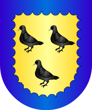 de sable, y un lebrel asido a una oreja del puerco-espín. 79.- Otros de Navarra, traen: Escudo de oro y tres palomas de sable, con el pico de plata. Bordura anglesada de azur. 80.- Otros: En campo de gules, una cruz vana y floreteada, de oro, acompañada de cuatro veneras de plata. 81.- Otros: En campo de oro, una faja, de gules, cargada de tres panelas de oro. 82.- Otros: En campo de plata, una banda, de azur y saliendo de ella, un guerrero, de oro con una espada en la mano. 83.- Los Aguirre, de Baquio y Arrieta, según una certificación de José Alfonso de Guerra y Villegas a favor de Juan de Solozábal, residente en la Puebla de los Angeles: En gules, una cruz vana y floreteada, acompañada de cuatro panelas de sinople. 84.- Otros: Escudo cortado: 1º, en campo de azur, cuatro dados, de plata, uno en cada cantón, y 2º, en campo de gules, un león pasante de oro y otros siete dados de plata puestas en la punta. 85.- Otros: Escudo cortado: 1º, jaquelado de sable y plata, de quince piezas, y 2º, en oro, una banda, de gules, acompañada en lo alto y en lo bajo de dos estrellas, también de gules. 86.- Francisco y Antonio Gómez de Arévalo señalan que el anterior escudo es de esta forma: En campo de gules, una cruz vana y floreteada de oro, acompañada de cuatro panelas de plata, una en cada hueco. Lema: "Reveladas y ganadas". Información de estos linajes complementada por cortesía de blasonari.net |
