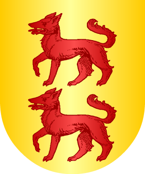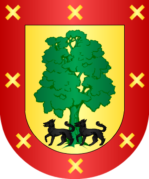 flores de lis de oro en souter. 4.- Las antiguas del Reino de Galicia, según J.-B. Rietstap, traen: En campo de oro, dos lobos de gules, puestos en palo. 5.- Las casas solares de León y Vitoria traen: Escudo de oro, con un árbol de sinople y dos lobos, de sable, pasantes al pie del tronco. Bordura de gules, con ocho sotueres de oro. 6.- Los de la casa solar, muy antigua, sita en las anteiglesias vizcaínas de Amorebieta y Murueta, ostentan estas otras armas: Escudo cortado: 1º, en campo de gules, una cadena de oro, y 2º, en campo de oro, dos vacas andantes de gules con collares de oro y azur, puestas en palo; medio partido, también de oro, con tres fajas de azur. 7.- Otros cambian las citadas fajas por cinco flores de lis de plata, perfiladas de oro y azur. 8.- El Emperador Don Carlos V concedió, en premio de