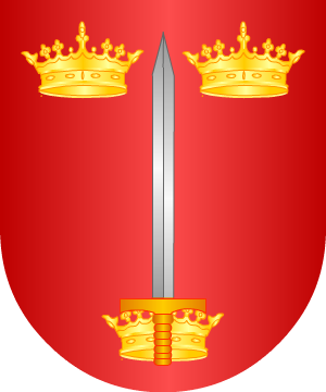 la punta del escudo y las dos pareadas en chief, y una espada elevada que suba