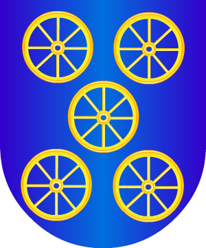 gules, con dos calderas de sable, y, en cada uno de sus cuatro ángulos,