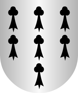 gules, con dos calderas de sable, y, en cada uno de sus cuatro ángulos,