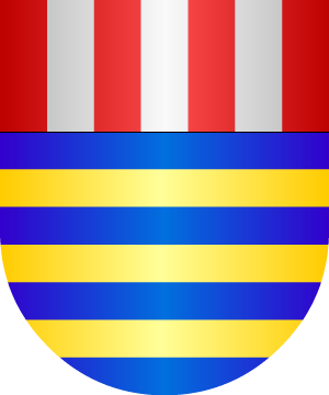 de gules, un castillo de oro, aclarado de azur, y 2º y 3º, en campo