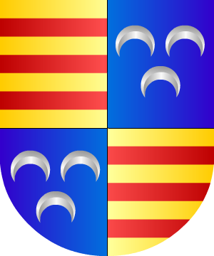 gules, con dos calderas de sable, y, en cada uno de sus cuatro ángulos,