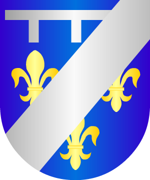 De gules, tres cabezas de ciervo de oro puestas de frente y bien ordenadas, astadas de plata; en el jefe de un lambel de tres pendientes de oro; y en punta, ondas de agua de azur y plata. Divisa: "Adstaut cervinae frontes super undas" en letras de oro sobre un volante de gules. |