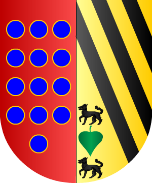 la ventana de la litera, de gules, y la franja y los palos, de oro. Estas armas