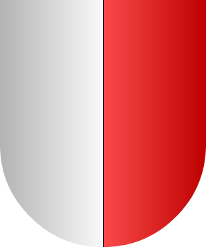 Escudo cortado: 1º, en campo de gules, un grifo, de oro, y 2º, jaquelado
