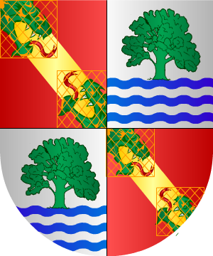 y 4º, en campo de gules, una banda de oro, engolada en cabezas de dragones
