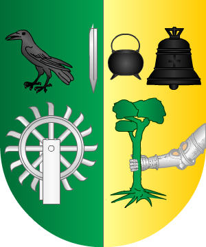 de plata y gules, y 2º, campo de azur, un león rampante de oro.