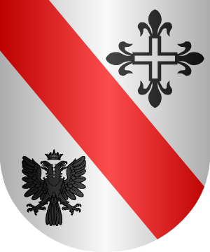campo de gules, tres flores de lis de plata, y 3º o manteladura, en campo