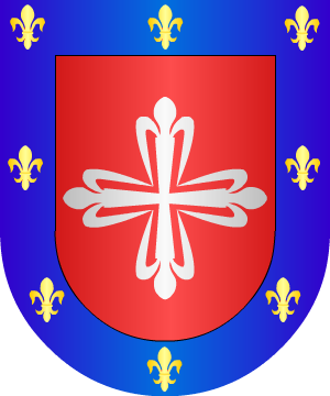 campo de gules, tres flores de lis de plata, y 3º o manteladura, en campo