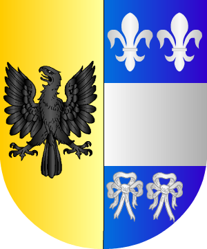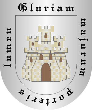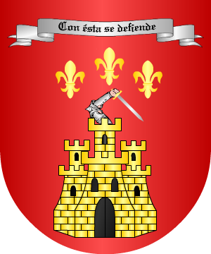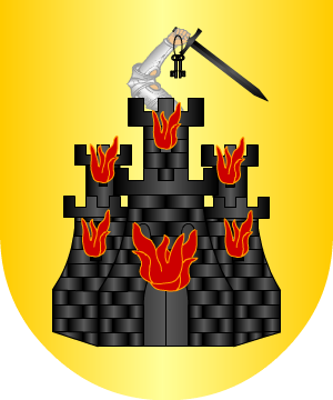 en llamas. 2.- Pedro Vitales y algún otro autor dicen que del homenaje del castillo sale, en vez del brazo, un hombre armado, que tiene en la mano diestra una espada desnuda de plata y en la siniestra dos llaves del mismo metal. 3.- Otros: En campo de azur, una flor de lis de oro en punta, superada de un castillo de plata, ardiente de gules, con destrocero armado, de lo mismo, moviente de ventana diestra, empuñando una espada de plata, guarnecida de oro y asiendo un cordón de oro, del que penden dos llaves de plata; el castillo adiestrado de un estandarte de plata, fustado y armado de oro. Por divisa, en filera de oro y letras de azur: "Post flammas et fidem nobilitas". 4.- Los radicados en Lugo, según Vicente de Cadenas, usan: En campo de plata, una cuerda trenzada, de sable, en forma de orla. 5.- Los apellidados Beltrán de Bernabé, originarios de Báguena, traen: En campo de oro, un castillo ardiente de sable, con flamas de gules, con destrocero moviente del homenaje, asiendo dos llaves y espada de sable. Información de estos linajes complementada por cortesía de blasonari.net |