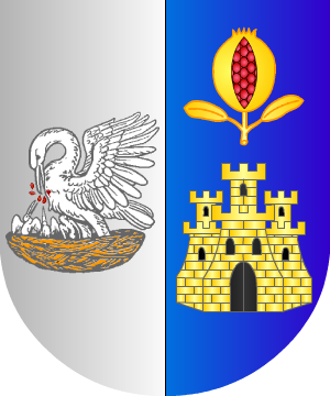 del mismo metal, lampasadas de gules, y acompañada en lo alto de un brazo