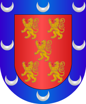campo de gules, tres flores de lis de plata, y 3º o manteladura, en campo