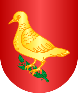 Escudo mantelado: 1º, en campo de gules, tres palos de oro; 2º, en