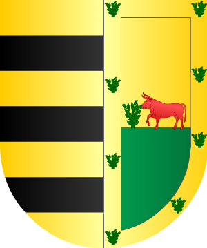 Psayla, traen: En campo de oro, un toro pasante de gules. Bordura de sinople