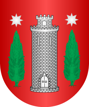En campo de gules, una torre de plata, aclarada de azur, puesta sobre aguas