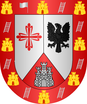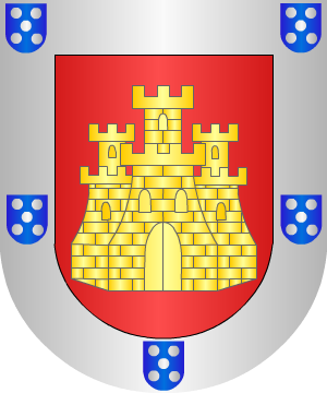 en campo de gules, un castillo de oro, aclarado de azur, por el apellido Carrillo,