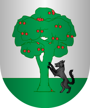 En campo de plata, un monte de azur sumado de una flor de lis del mismo color,