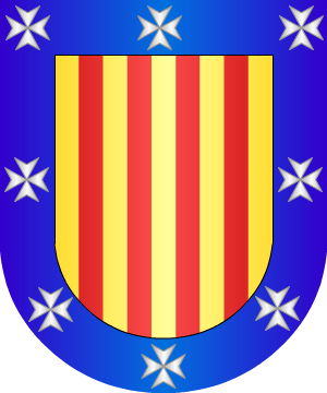 oro con cuatro palos de gules, y bordura de azur, con ocho cruces de San Juan
