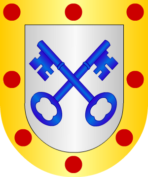 de azur, acompañada de dos cruces huecas, de gules, una arriba y otra