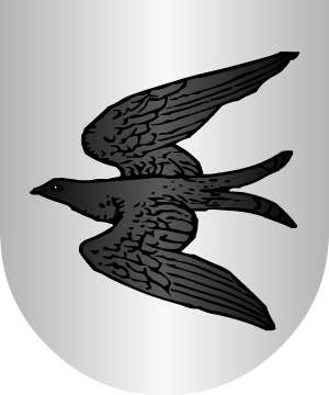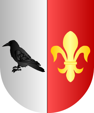 Escudo partido: 1º, de plata, con el grajo de sable, y 2º, de gules,